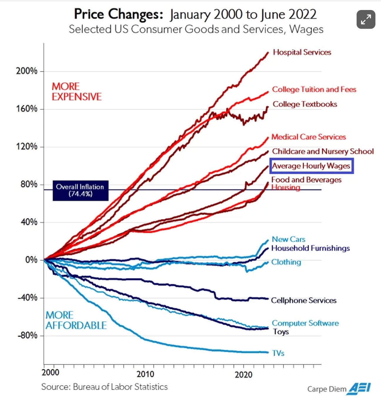 What about DEI offices and initiatives - are they driving up costs across higher education? First, I want to acknowledge that yes, universities have fumbled the ball on costs in many ways. They are way too unaffordable (as a parent of teens, I’m aghast at tuition numbers), and are prone to mission creep, administrative bloat, and a “bells and whistles” rat race. When I toured schools with my daughter last summer, not only did every college gym have a fancy climbing wall, they boasted perks like a pet therapy room and a smoothie bar. However, high tuition is not a particularly partisan issue. When people ask, ‘Why has college tuition gone up while prices in many other sectors have dropped?’, there’s a pretty simple answer: labor-intensive industries (healthcare, childcare, higher education) have seen rising costs while industries that don’t depend on people (consumer goods, tech) have dropped. See this chart from the American Enterprise Institute, shared by Noah Smith . Moreover, with higher-ed specifically, some price increases are driven by competition and consumer demand. After your 10th college tour visit to the climbing wall, you start having doubts about the SLAC with the janky gym where your kid’s climbing aspirations may never be realized. You also want your kid to have access to mental health care, student counseling and advising, security staff roving the campus, and fun rah-rah sports games to attend – all of which costs money. At my university at least, spending on DEI-related services is about 1/100000th of the spending on the football team. Indeed, many DEI efforts are quite weak, performative, and under-funded. Once Trump started issuing Executive Orders opposing them, many universities dropped or buried their existing offerings, which shows that they weren’t considered central to their academic missions in the first place. (I think they should be stronger and better-funded, personally).