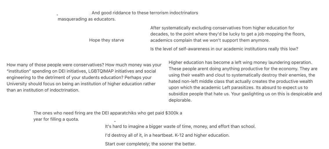 I managed to hit a similar seam here on Substack last week. In a Note I posted about the sudden firings of 162 hard-working staff members at my university, I got expressions of sympathy and concern, but I also seemingly uncorked a wellspring of bile. I don’t know what got unleashed within the Substack algorithm, but dozens of people came out of the woodwork to express kind-hearted sentiments (“Hope they starve”) and yell at me about how universities are evil and ought to be defunded and destroyed. If I had posted about mass layoffs at tobacco companies, banks, private equity firms, or companies that mock and club baby seals, I don’t think I would’ve received as much of an outpouring of vitriol, most from anonymous accounts, echoing the same themes.