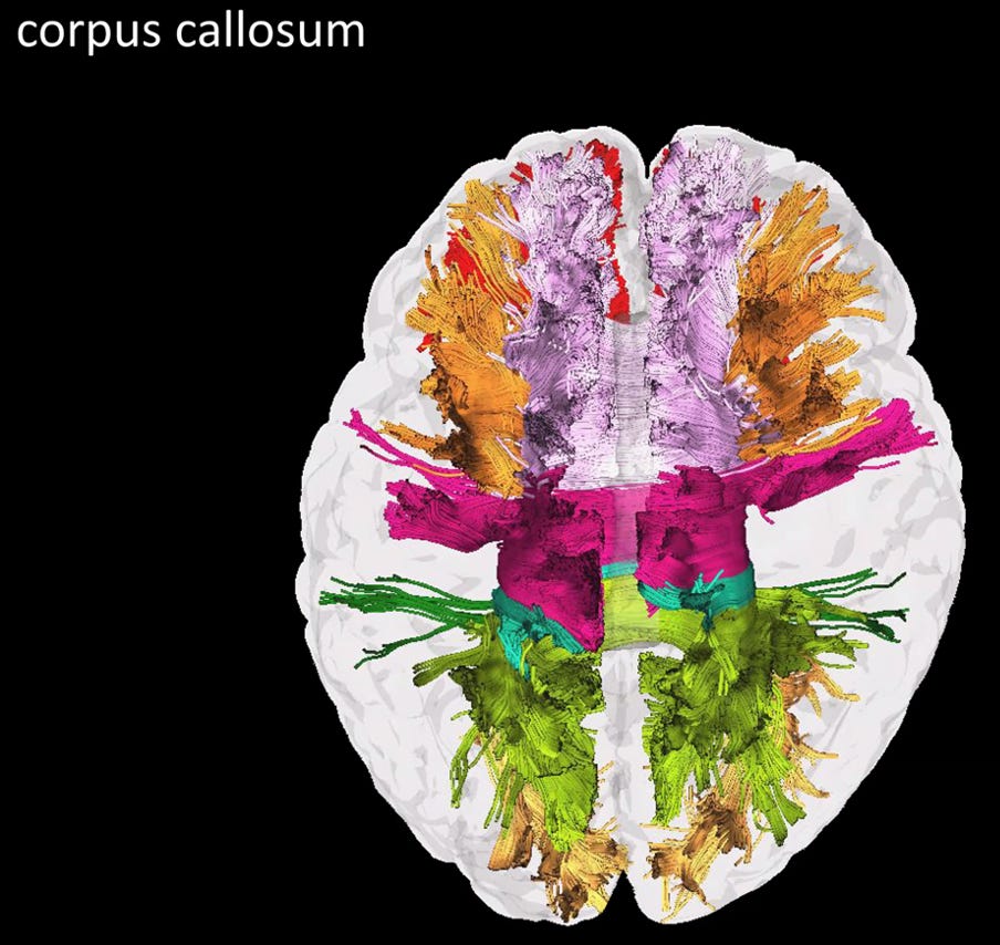 Habibi’s group also performed a type of neuroimaging called Diffusion Tensor Imaging (DTI), which can measure the structural connectivity of the brain by looking at white matter fibers, which form myelin tracts linking different regions together. In addition to being a really interesting way to look at the brain, DTI yields stunningly beautiful images, as shown below. Habibi’s DTI analysis found differences in the white matter integrity of the corpus callosum, the bundle of fibers in the middle of the brain that connects the left and right hemispheres. Children in the music group showed corpus callosum patterns indicating more integration across the brain, especially of the frontal areas. This makes sense, because in order to hear and play a piece of music, you need to be able to coordinate disparate brain functions together, including your auditory processing, your motor actions, and your executive functioning (thinking and planning).