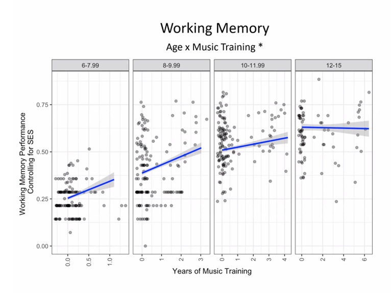 Along similar lines, Habibi also found that the more musical training kids received, the better their working memory performance - with the greatest benefits in the first few years of training, leveling off as the kids got older.