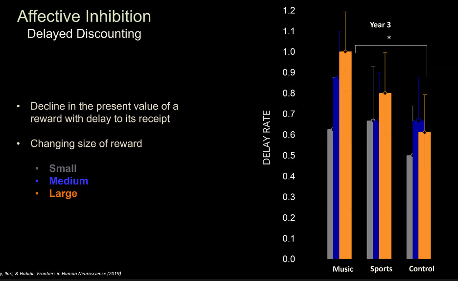 Kids in the music group also showed a better ability to delay gratification. Habibi’s group gave them a delayed discounting task where kids could either choose a smaller but immediate reward, or choose to wait longer for a bigger reward. You may have heard of the marshmallow task, in which kids can eat one marshmallow right away or wait and get two marshmallows. This is a delayed discounting task, and Habibi gave a similar task to kids in her lab. As the figure below shows, kids who had gotten musical training could wait longer than the kids in the control group for a bigger reward, with kids in the sports group in between.