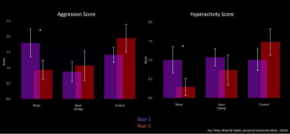 In addition to showing up in the brain, Habibi also found that the effects of music training showed up in the kids’ behavior. According to parent reports, kids in the music group were less aggressive and hyperactive than kids in either of the other two groups. You can see this in the figure below. In the first year of the study (the purple bars), the music, sports, and control groups had fairly equal levels of aggression and hyperactivity. But by the fifth year (the red bars), the kids in the music group were clearly less aggressive and hyperactive than the kids in the control group, with the sports group right in between.