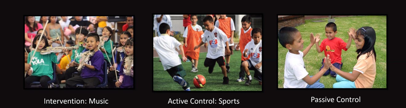 Habibi and Ilari recruited two comparison groups of similarly-aged children whom they followed over the same time intervals, so as to ensure that any effects she detected were specific to music training and not just to kids’ overall development over time. One was a passive control group who wasn’t assigned to any special programming. But Habibi also wanted an active control group, so she could control for some of the aspects of the music training program that weren’t specific to music, like the fact that it was structured, group-based, and challenging. She decided to simultaneously follow a group of kids who were enrolled in a youth sports program.