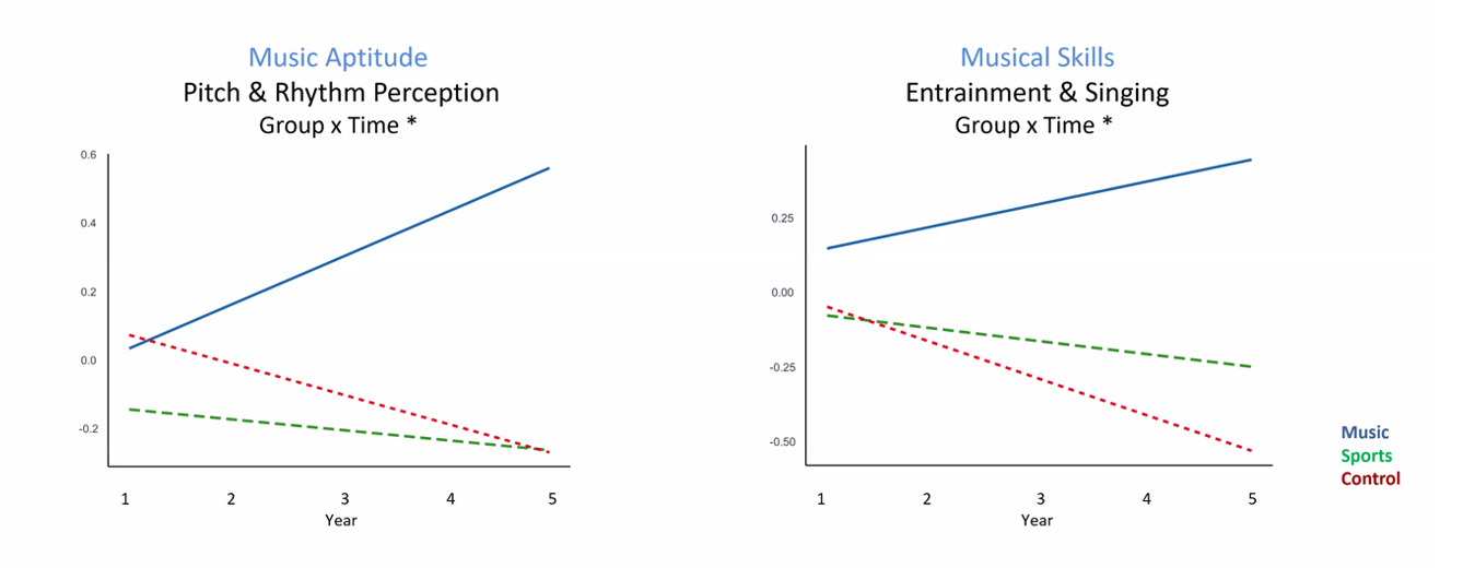 In summary, Habibi’s research found that musical training conferred a number of benefits to these kids beyond just musical skills, ranging from more efficient auditory processing in the brain, to greater integration across the left and right hemispheres, to reduced aggression and hyperactivity, to improved executive functioning (like working memory and the ability to delay gratification). Many of these benefits were most pronounced in the first few years of musical training, and the differences between groups seemed to level off as the kids got older, flattening out around age 10. However, given that ages six to 10 are crucial elementary school years for learning the basics of reading, math, and classroom behavior, these early benefits had the potential to set the kids up for longer-term success.