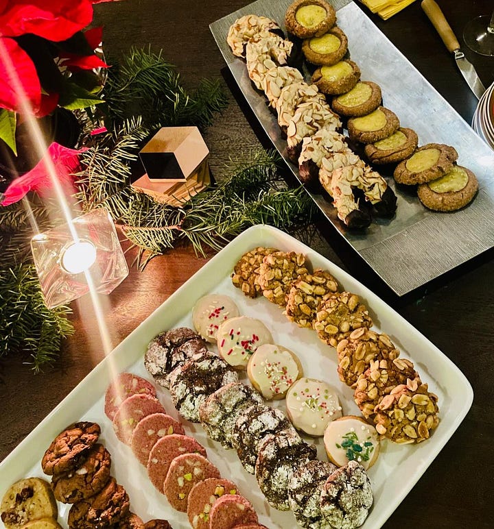 On the baking front, I participated in a high-stakes cookie swap with my most serious baker friends and it nearly broke me. This cookie swap is in its 14th year or so, and these ladies are not messing around. It’s a faux pas to repeat a recipe that someone has already made (I nixed my original cookie choice when someone reminded me that they’d already brought it to the swap back in 2018), so we’re always looking to top ourselves. Every year there’s a flurry of emails when the New York Times, Bon Appetit, and Food & Wine cookie issues come out and we start clipping recipes. We all want to be first out of the gate with the most au courant cookie of 2025. People do test batches just to optimize their cookie choice! I think my contribution was pretty good: key lime pie thumbprint cookies, swiped right out of this year’s Bon Appetit. You make a graham cracker cookie base, indent and chill it, and then fill with a creamy lime pie filling. The problem is that it’s not a very scalable cookie, and I was charged with making seven dozen. Four hours later, I could barely peel myself off the floor to actually go to the swap. But look at these glorious cookies! (The key lime pie ones are in the top right corner).
