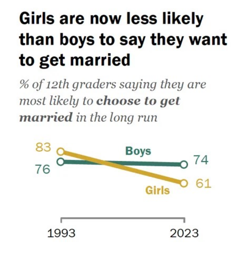 The below figure has been making the rounds on social media, indicating that young people, especially young women, are losing interest in marriage. Depending on your vantage point, this development reflects: