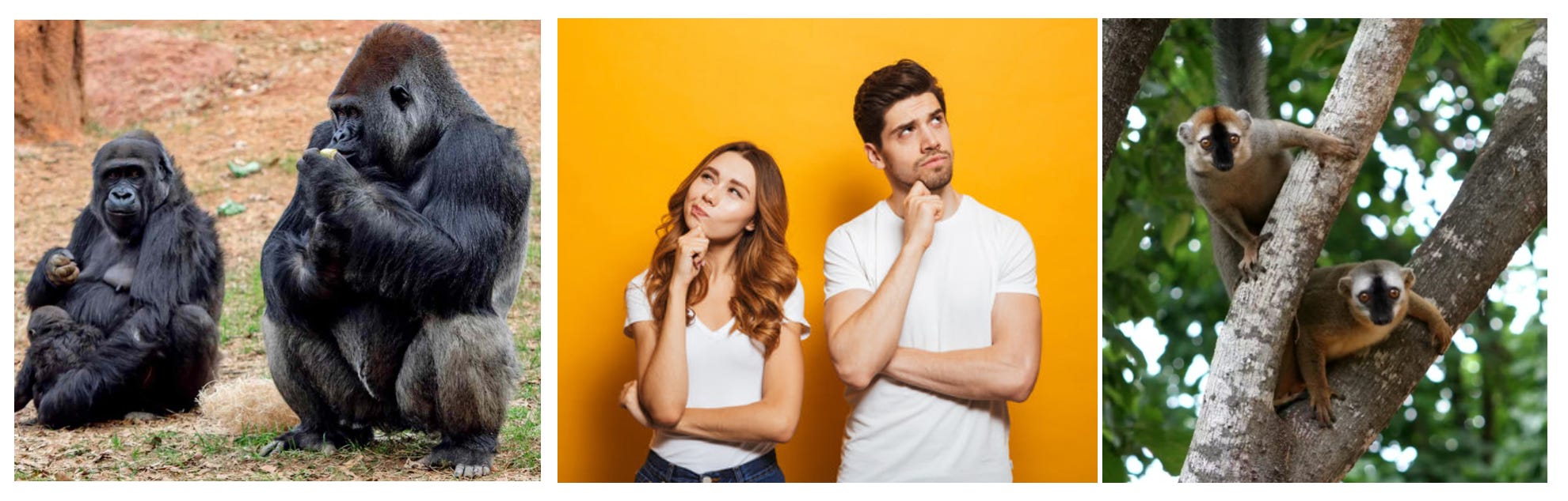 Unlike many mammals, who mate with strangers in wham-bam fashion, humans have been forming stable pair-bonds for a significant chunk of our evolutionary history. You can actually tell this by looking at the size differential between modern men and modern women; although the average woman is shorter than the average man (something of which I’m all too aware, now that my 14-year-old son has surpassed me in height), men are only about 7-10% taller than women. Compare us to gorillas, whose males are 50-100% bigger. Gorillas are polygynous, and their larger size makes it easier for them to fight their way to harem dominance. Over millions of years of evolutions, human men have gotten smaller, relative to women, and have also evolved smaller teeth – good signs that we’ve settled into more stable relationship territory.